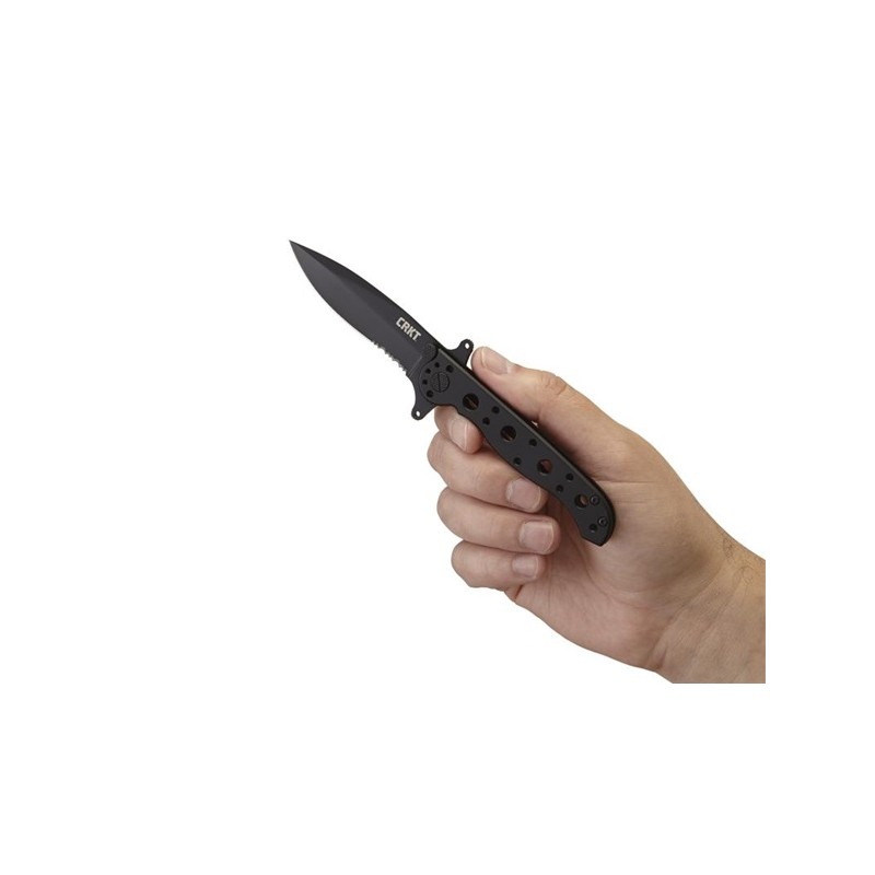 Lame noire semi-dentée acier 8Cr13MoV avec « flipper », à cran intérieur et à bouton double, manche à trous 10 cm acier inox noir, avec clip.