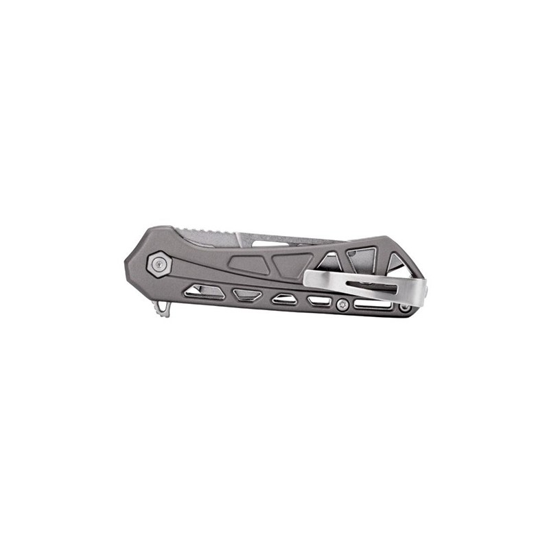 Lame tanto à trous acier 7Cr17 avec « flipper » et cran intérieur, manche 9 cm aluminium anodisé gris à trous, avec clip.