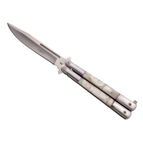 Lame acier inox 420 mat, manche 13 cm acier inox satiné avec inserts résine façon nacrine.