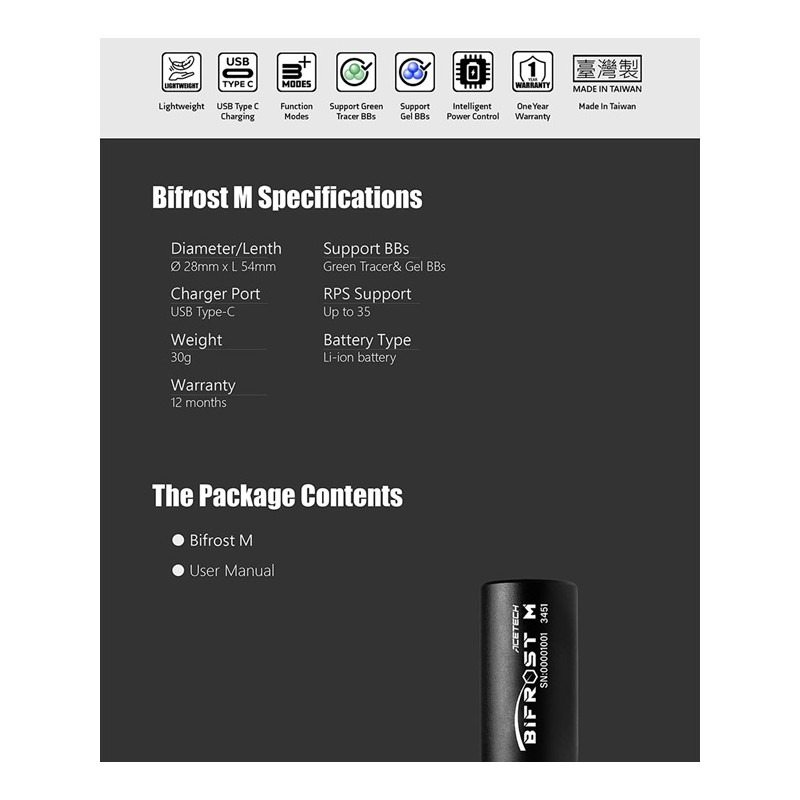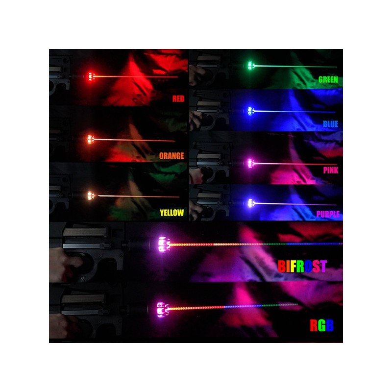 Bifrost M, avec sa fonction de base d'unité de traçage, comprend également des LED frontales qui simulent un flash de bouche et disposent de 11 modes de traceur.
